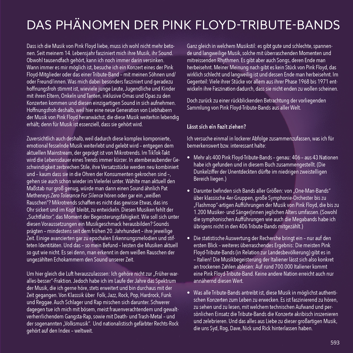 Pink Floyd ist weit mehr als eine Psychedelic-Prog-Rock-Band: Pink Floyd ist ein weltweites Phänomen. Im Laufe meiner Recherchen bin ich auf über 400 Tribute-Bands gestoßen. Auf allen Kontinenten (außer der Antarktis) haben sich Bands formiert, um als Epigonen die Musik ihrer Vorbilder auf die Bühne zu bringen – oft mit einem erstaunlichen Grad an Perfektion. Dabei sind gar nicht ’mal die „üblichen Verdächtigen“ gemeint (Australian Pink Floyd, Brit-Floyd, Echoes usw.).