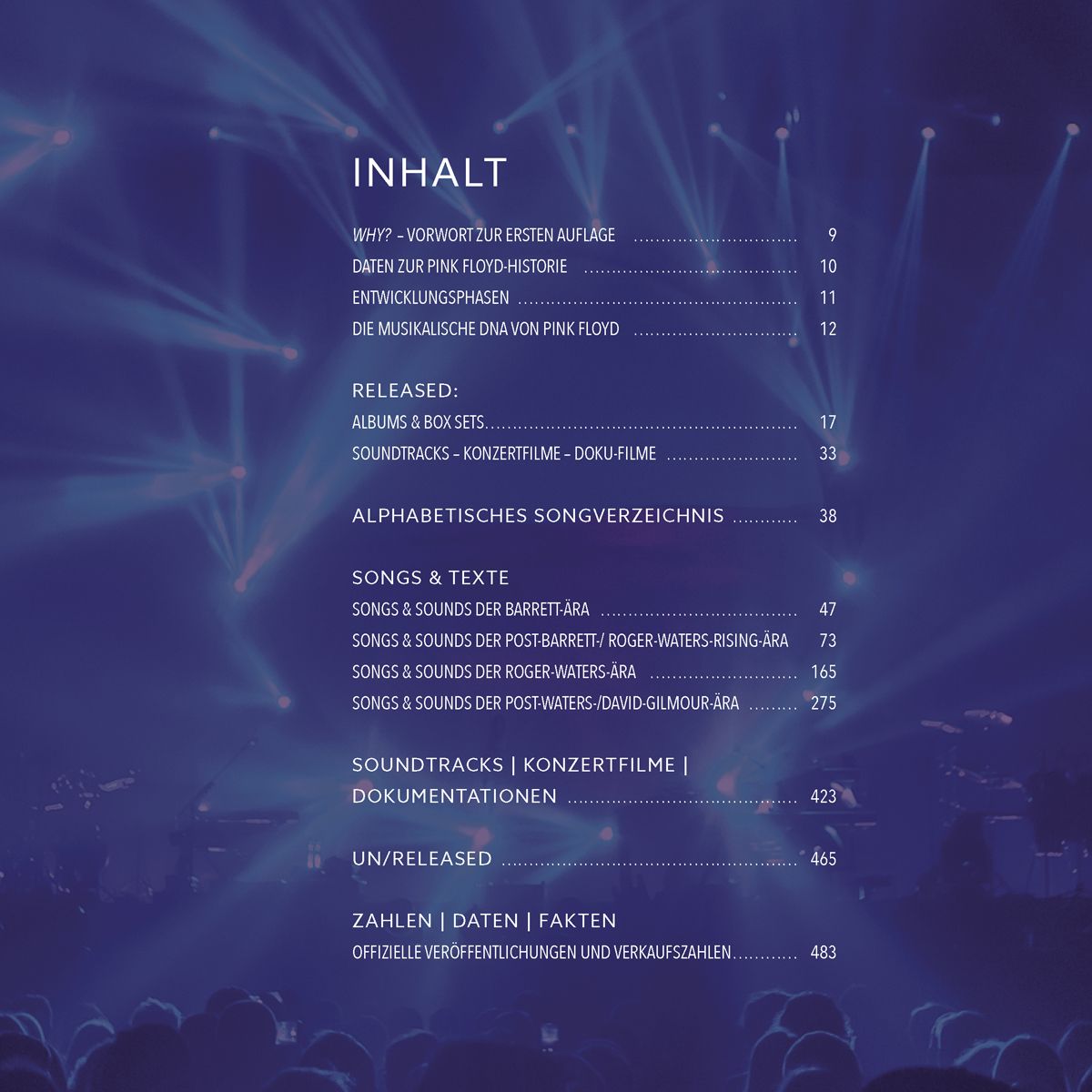 Eine Sammlung aller Songs aus dem umfangreichen musikalischen Gesamtwerk von Pink Floyd. Aufgelistet sind alle Songs in zeitlicher Abfolge ihrer offiziellen Veröffentlichung inklusive der Lyrics im Original und in deutscher Übersetzung.